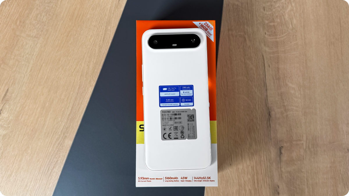 Несмотря на рекордную тонкость, Tecno удалось разместить аккумулятор на 5160 мА·ч. Этого хватает на день активного использования. Поддерживается быстрая зарядка 45 Вт — смартфон полностью заряжается примерно за час. Есть обходная зарядка и интеллектуальное управление питанием, продлевающее срок службы батареи.