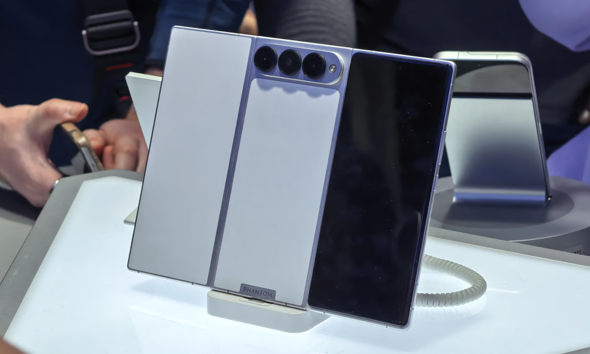 Еще одна громкая демонстрация — Tecno Phantom Ultimate G Fold. Это тройной складной смартфон, который уже показывали ранее, но на MWC 2026 он снова оказался в центре внимания.