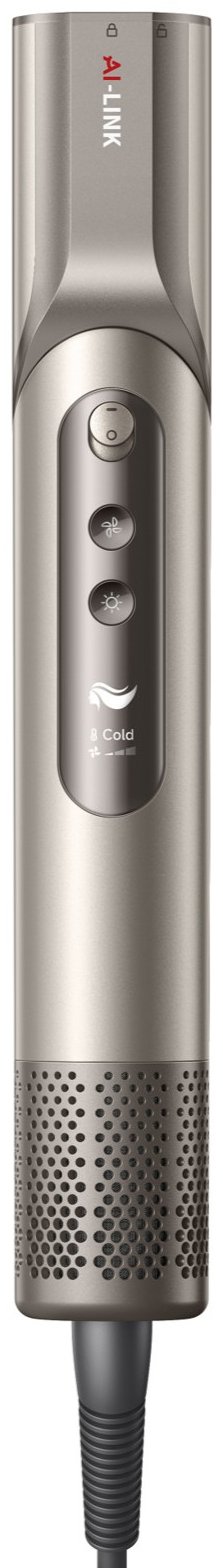 Фен работает с уровнем шума около 65 дБ, что заметно тише классических моделей. Встроенный генератор ионов снижает статическое электричество и помогает сохранить гладкость волос. На корпусе расположен дисплей, отображающий текущие настройки, а съемный фильтр упрощает уход за устройством.