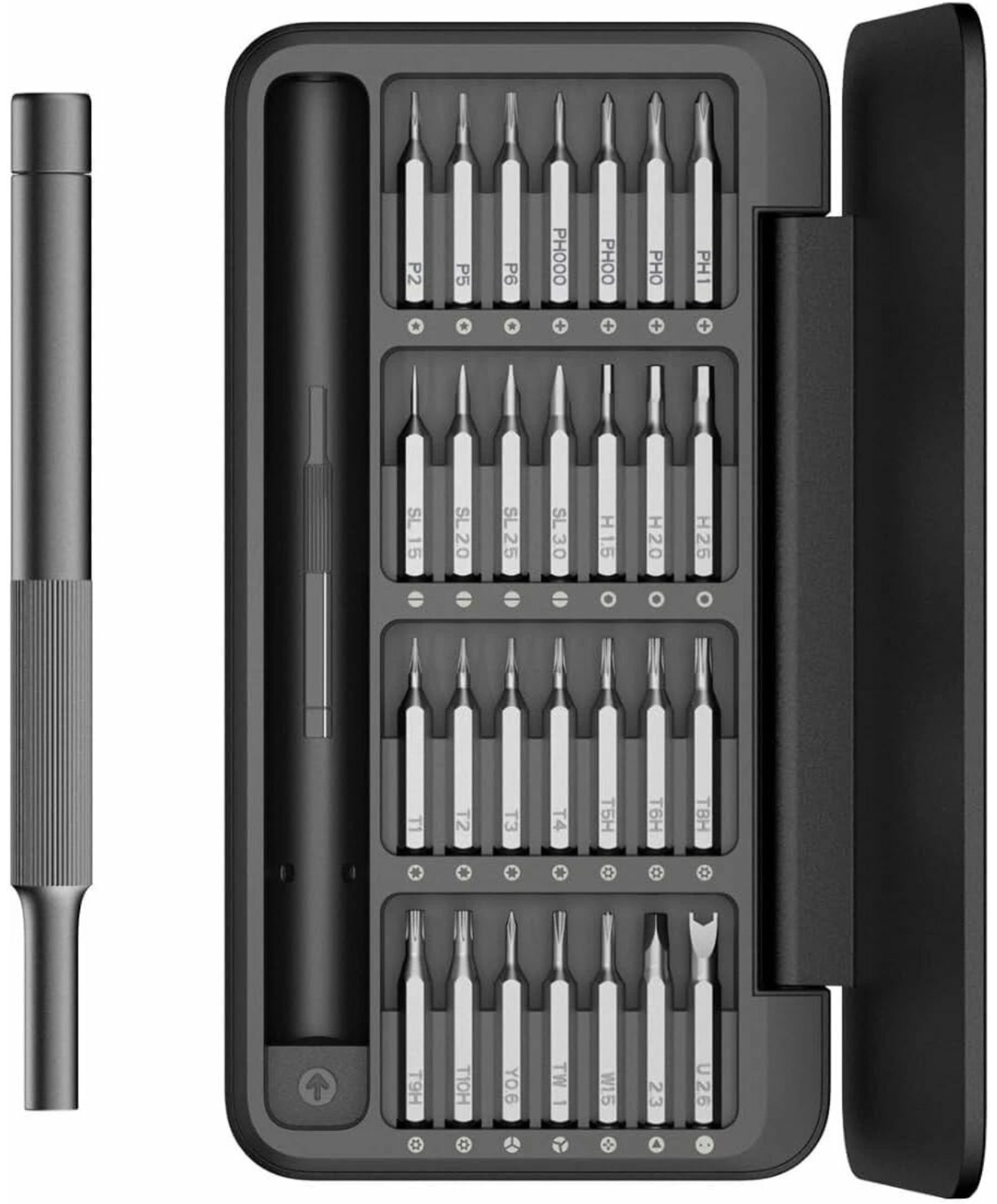 В комплекте предусмотрены биты популярных форматов, включая PH0, PH1, PH00, PH000, H1.5, H2, H2.5, SL1.5, SL2, SL2.5, SL3, T1, T2, T3, T4, TW1, T5H, T6H, T8H, T9H, T10H, U2.6, P2, P5 и P6. Такой набор делает инструмент универсальным решением для точных работ, где требуется совместимость с разными типами крепежа.