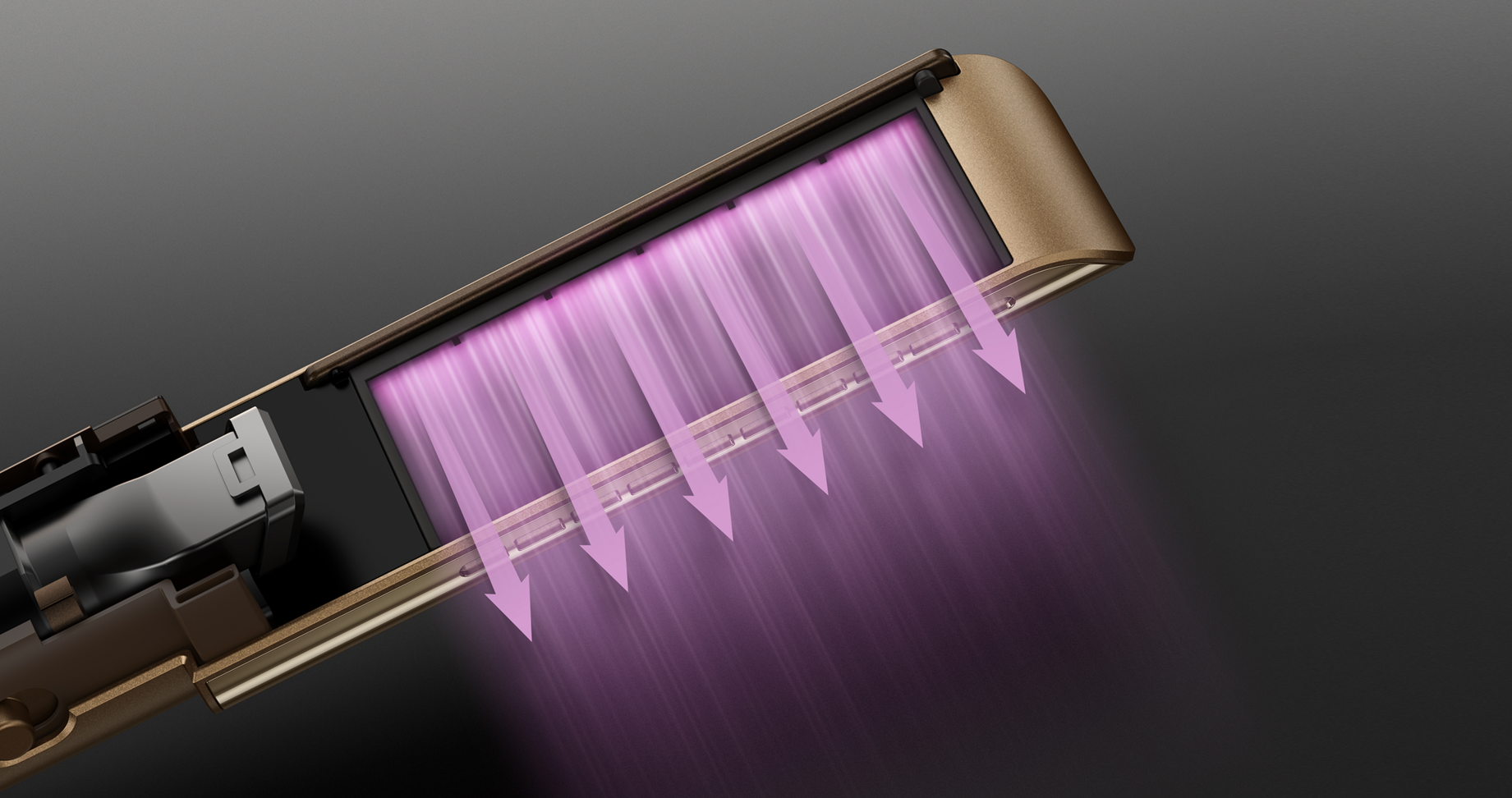 Внутри устройства расположена камера с 6 отверстиями и 5 зонами воздушного потока, обеспечивающая равномерное распределение тепла. Поток воздуха направляется по специальным каналам, выпрямляя волосы с минимальным контактом с нагревательными пластинами. Это делает укладку бережной и эффективной одновременно.